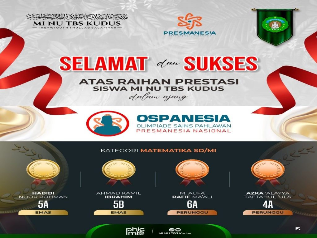 Kudus – Bertambah lagi prestasi siswa MI NU TBS tahun ini. Empat siswa bersaing pada ajang OSPANESIA (Olimpiade Sains Pahlawan Presmanesia Nasional) kategori MATEMATIKA SD/MI yang diselenggarakan secara Online oleh Yayasan Presmanesia pada Ahad, 12 November 2023 tepat 2 hari pasca hari pahlawan.